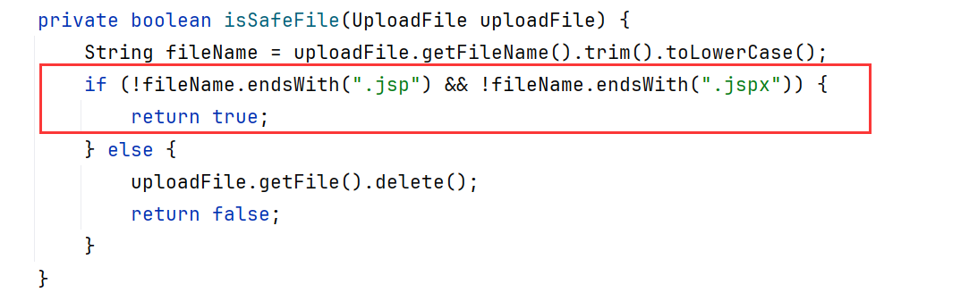 isSafeFile方法方法用于判断上传的文件类型是否是.jsp或.jspx文件