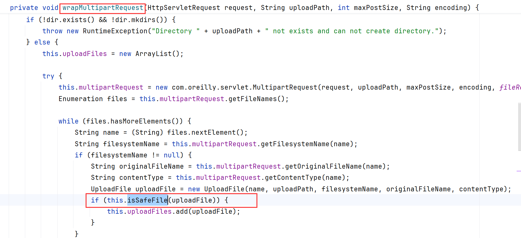 wrapMultipartRequest方法中可以看到调用了isSafeFile方法