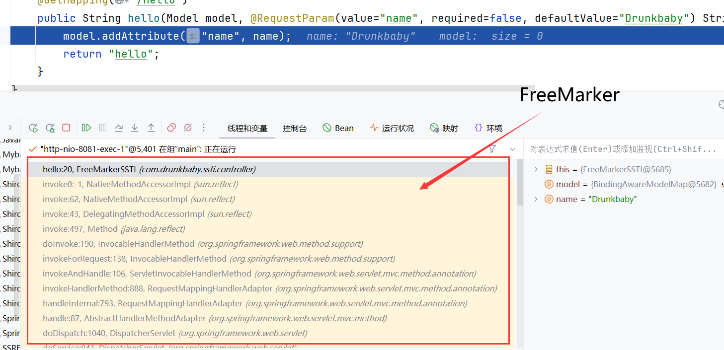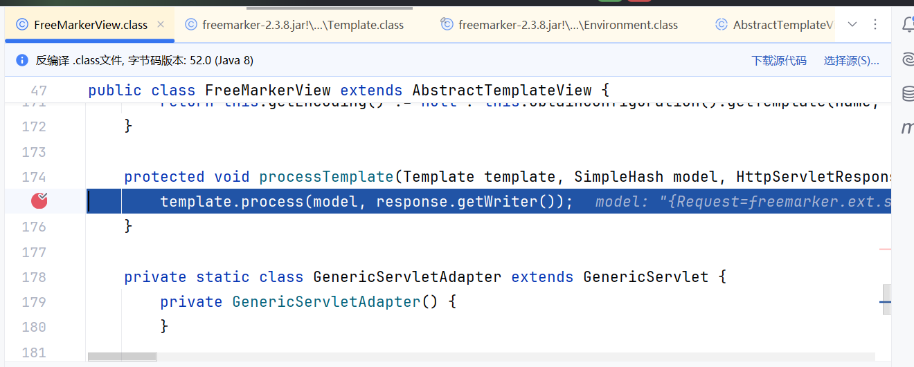 下断点后可以看到触发ftl风险代码的调用栈是从FreeMarkerview类的processTemplate方法开始的