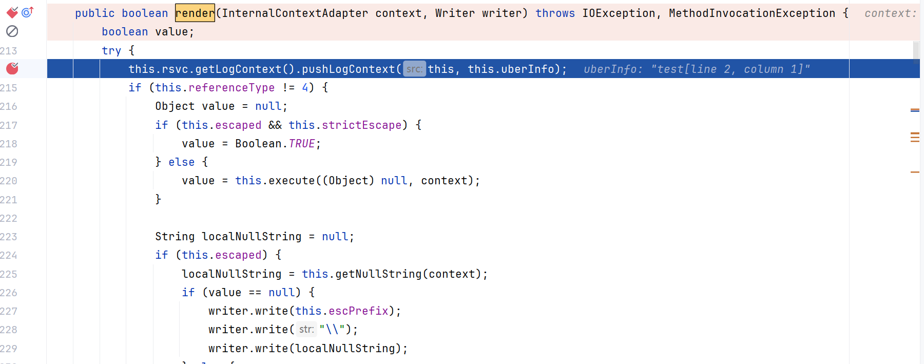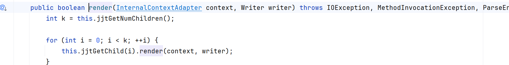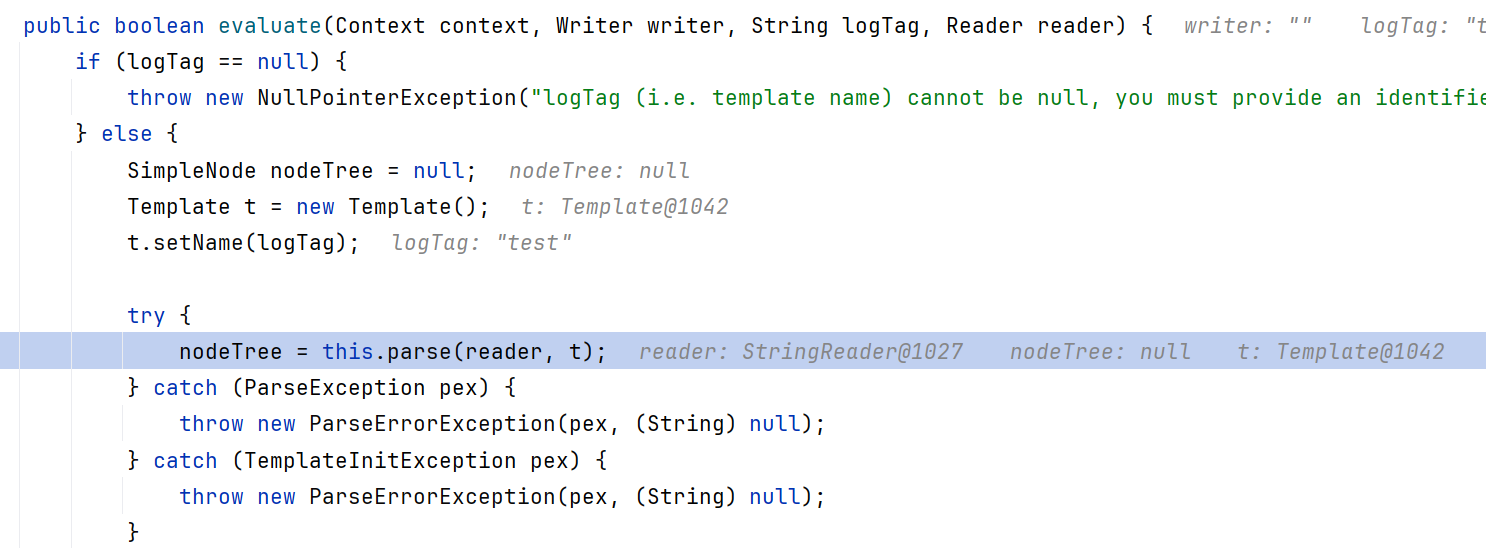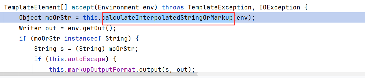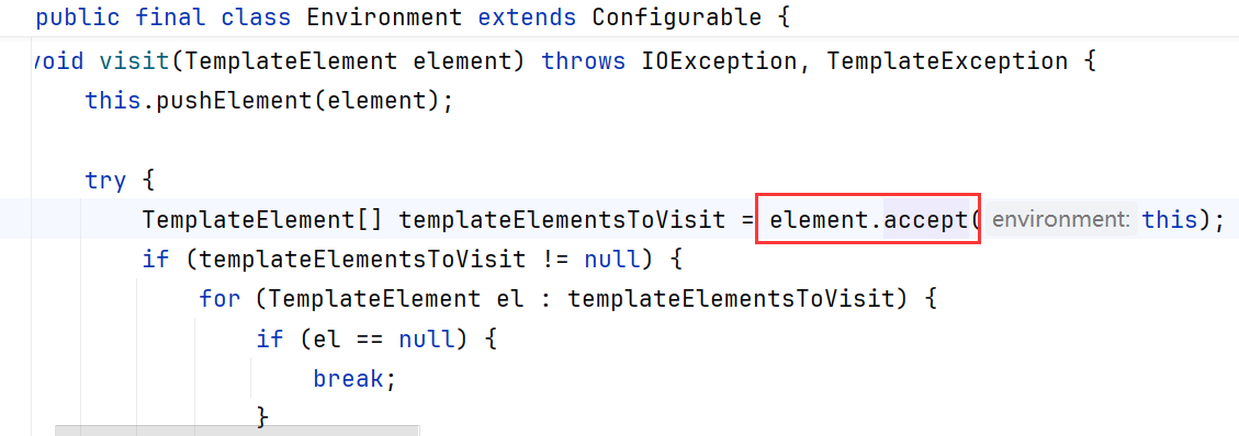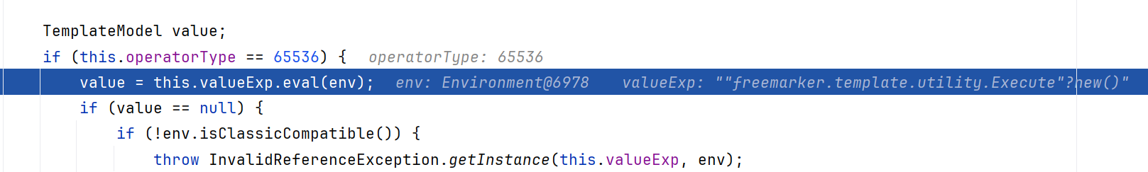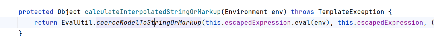 1 2 TemplateModel _eval (Environment env) throws TemplateException { TemplateModel targetModel = this .target.eval(env);