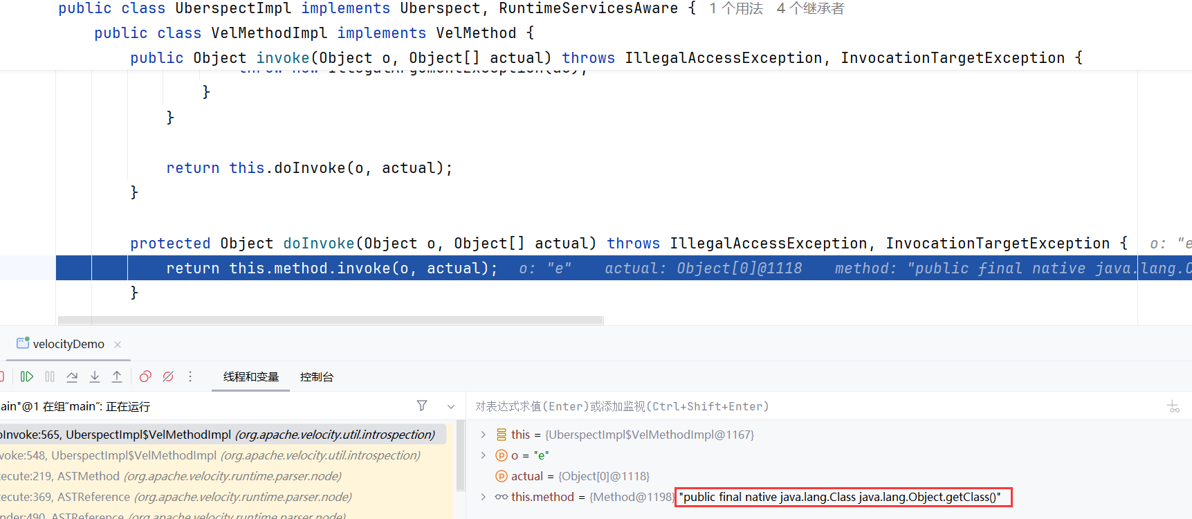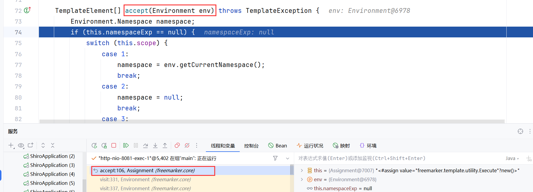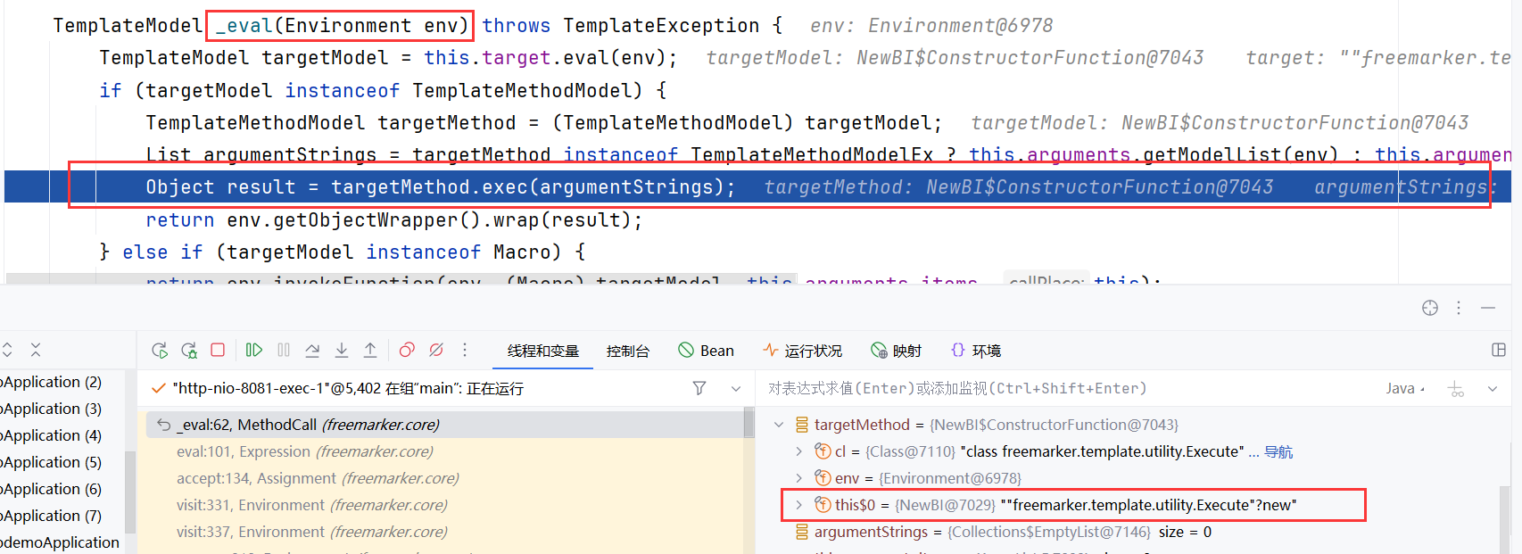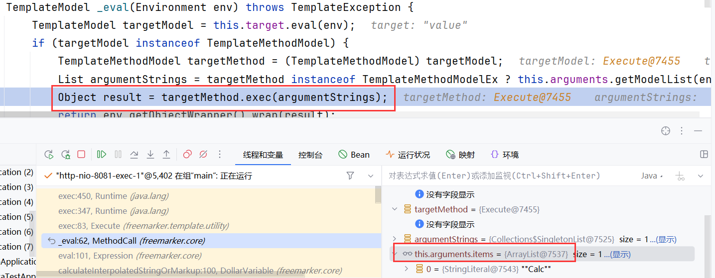 经过一系列复杂的代码可以看到 targetMethod 目前就是我们在 ftl 语句当中构造的那个能够进行命令执行的类