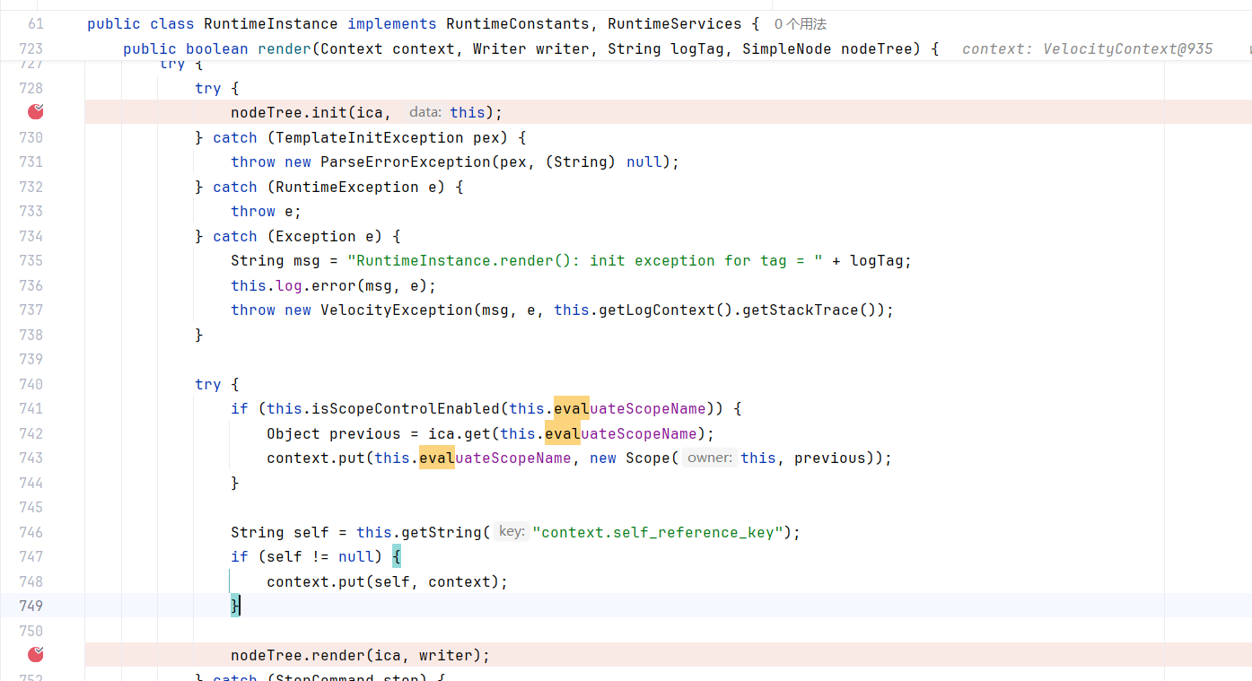 三个模板漏洞都是在渲染代码中触发漏洞,走入对应的render渲染方法开始,最终走到Method类的invoke方法利用java反射调用runtime(或其他)方法执行exec命令后结束