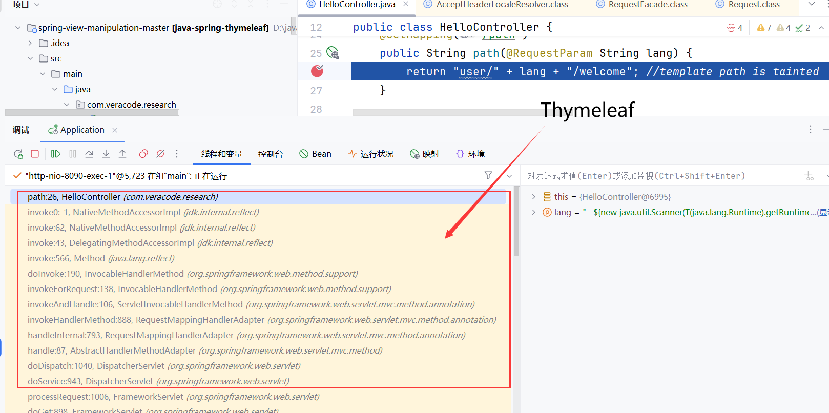 SpringMVC 视图解析过程分析 在controller漏洞代码处下断点,可以看到若有完整的MVC框架,经过的调用栈都是相同的