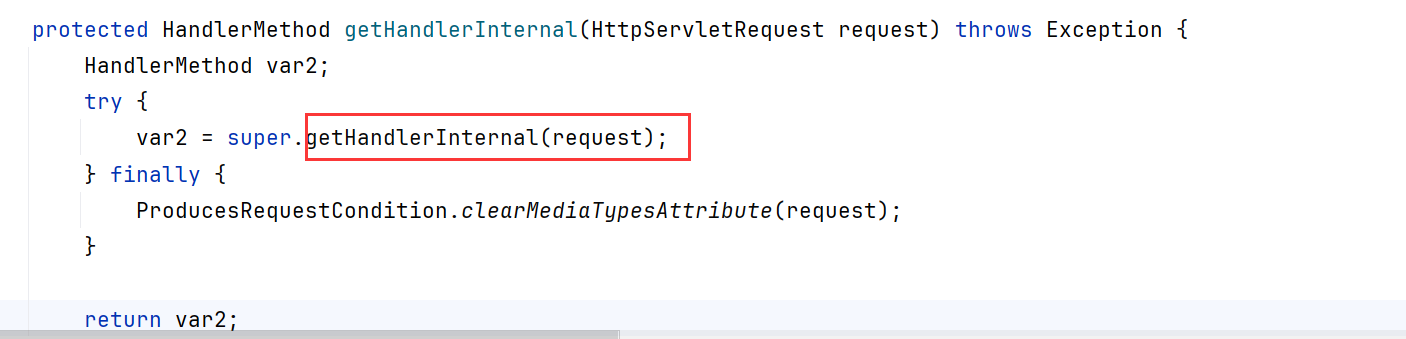 AbstractHandlerMapping 类中的 getHandler 方法中首先根据 request 获取 handler ,看到调用了新的getHandlerInternal 方法