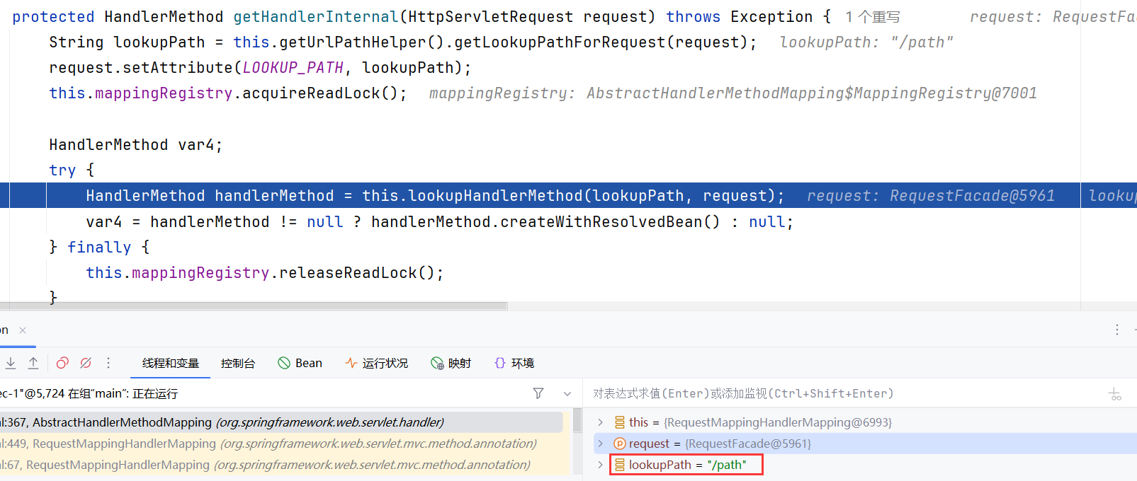 跟进一下AbstractHandlerMethodMapping 类中的 getHandlerInternal 方法,看到该方法首先获取 request 中的 url,即 /path,用来匹配 handler 并封装成 HandlerMethod,然后根据 handlerMethod 中的 bean 来实例化 Handler 并返回。