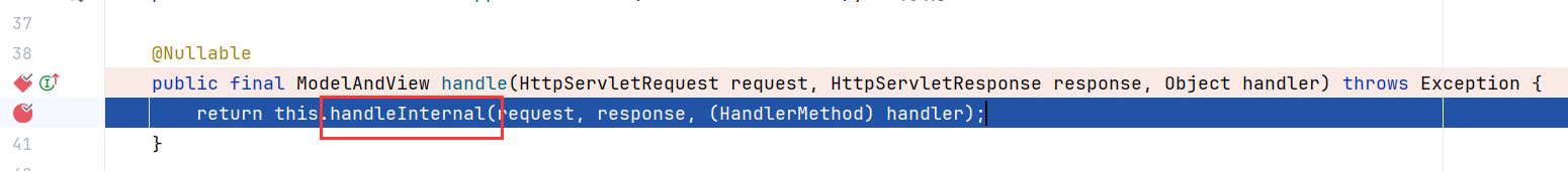 在 AbstractHandlerMethodAdapter 的 handle 方法中又调用了 RequestMappingHandlerAdapter 类的 handleInternal 方法 :