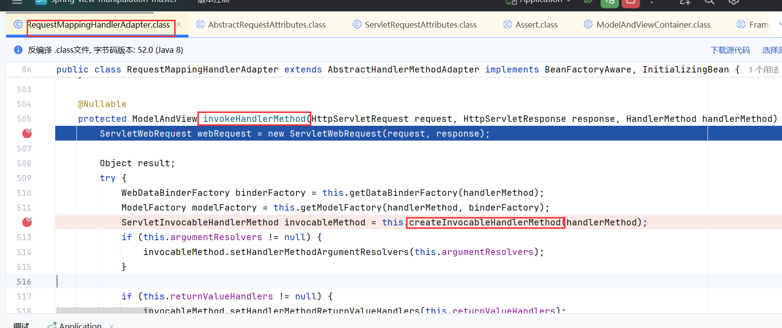 往下走,先调用 AsyncWebRequest 进行异步请求的包装,后续针对是否是异步请求,做不同的处理。继续往下走,到 524行的地方是关键点,它调用了 ServletInvocableHandlerMethod.invokeAndHandle() 方法,调用这个方法的作用主要是获取到了 returnValueHandlers,跟进看一下。