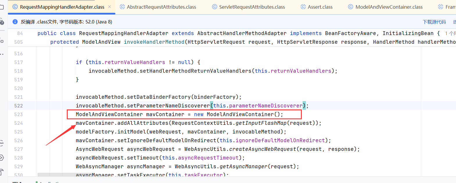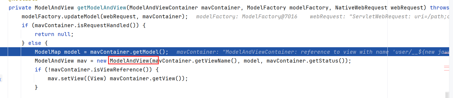 通过上面的操作,将返回值设置为mavContainer.viewName,执行上述操作后返回到RequestMappingHandlerAdapter#invokeHandlerMethod中。通过getModelAndView获取ModelAndView对象。
