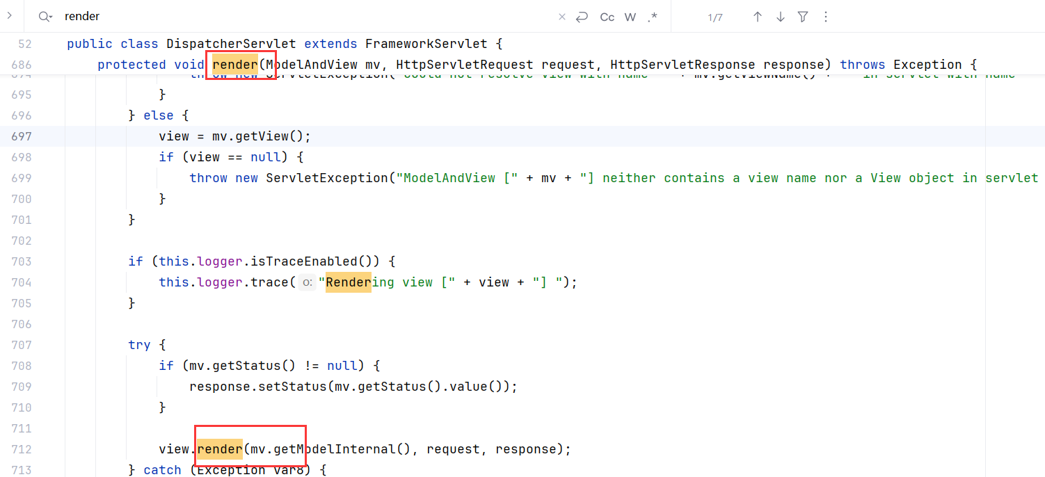 通过前两个对模板的视图解析与渲染代码分析,我们可以看到开始渲染调用的是render方法,Velocity调用VelocityView#render渲染,FreeMarker调用``FreeMarker#render渲染,同样Thymeleaf调用ThymleafView#render`渲染。