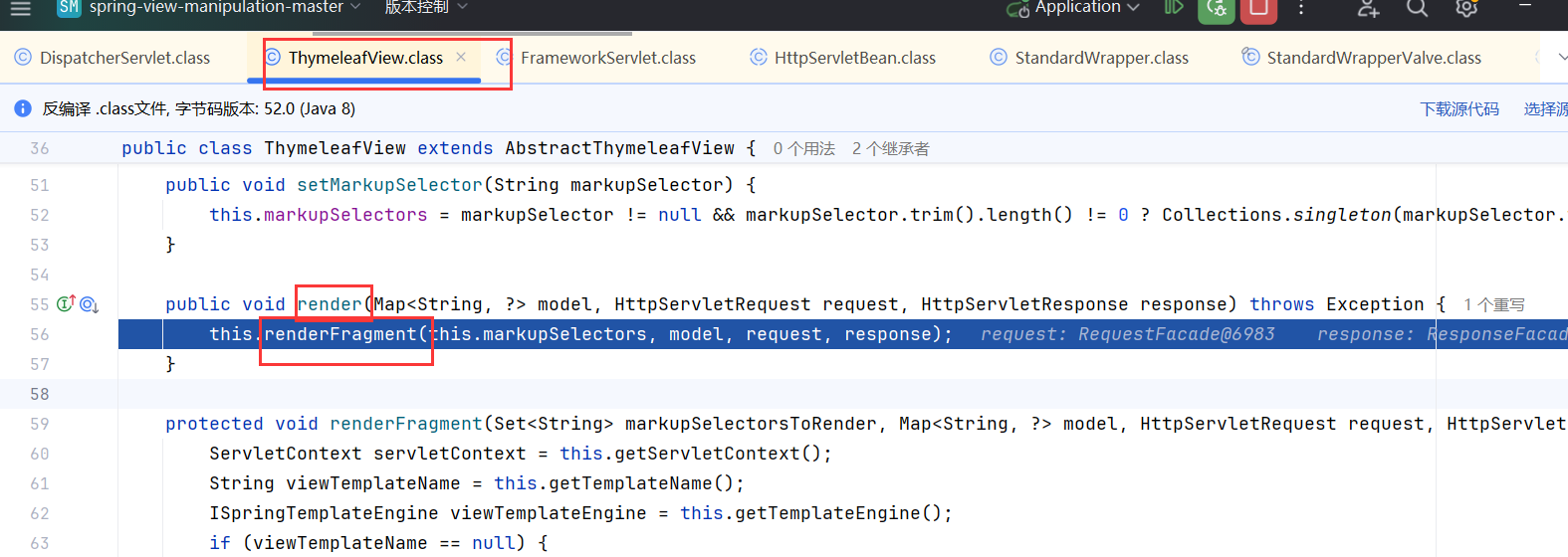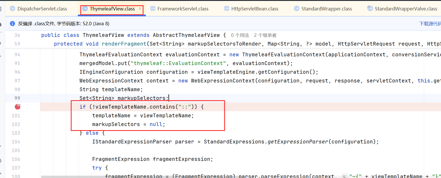 之后开始渲染,如果此处是 FreeMarker,就会去 FreeMarkerView.render(),如果是 Velocity,就会去 VelocityView.render(),我们此处是 Thymeleaf,会去到 ThymeleafView.render(),跟进。