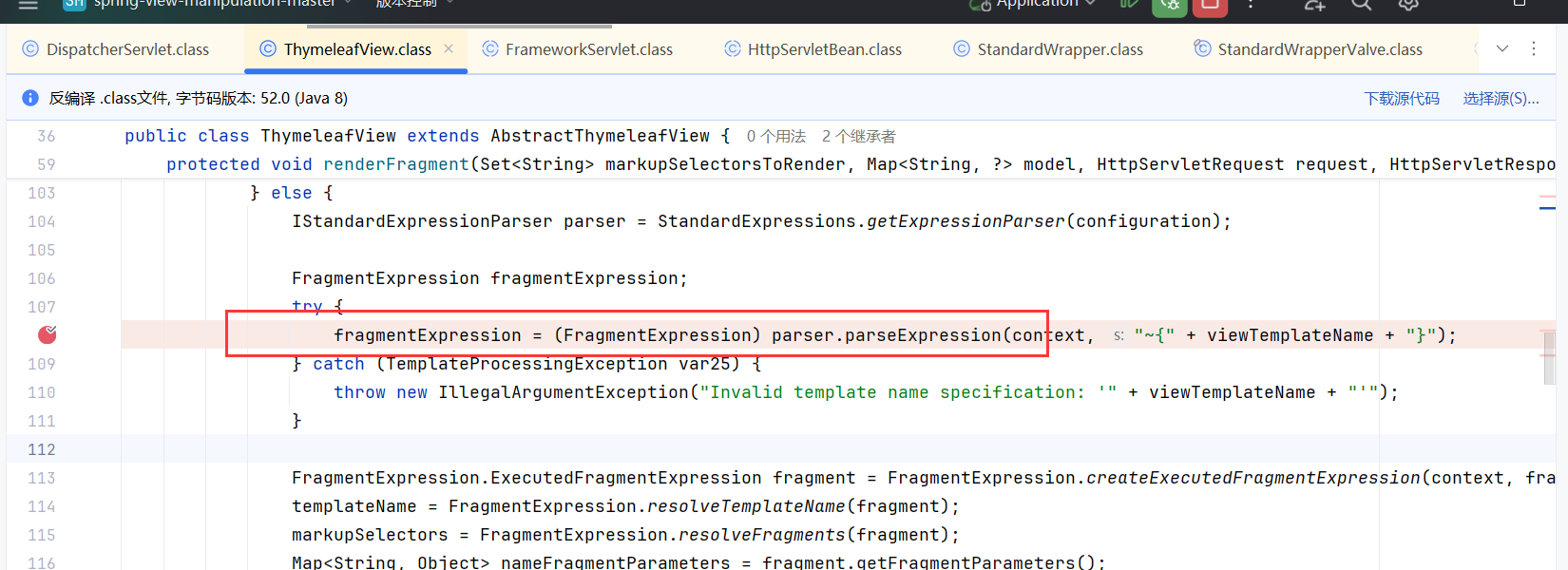 继续往下走,第 108 行,调用了 (FragmentExpression)parser.parseExpression(),对我们输入的这一串字符进行了处理。