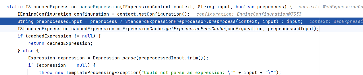 1 2 3 4 5 6 7 8 9 10 11 12 13 14 static String preprocess (IExpressionContext context, String input) { if (input.indexOf(95 ) == -1 ) { return input; } else { IStandardExpressionParser expressionParser = StandardExpressions.getExpressionParser(context.getConfiguration()); if (!(expressionParser instanceof StandardExpressionParser)) { return input; } else { Matcher matcher = PREPROCESS_EVAL_PATTERN.matcher(input); if (!matcher.find()) { return checkPreprocessingMarkUnescaping(input); } else { StringBuilder strBuilder = new StringBuilder (input.length() + 24 ); int curr = 0 ;