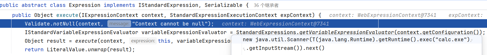 继续往下走,到了 expression.execute(),也就是命令执行的地方,语句就变成了