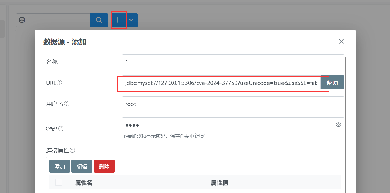 /schema/saveAdd。 - 选择”数据源”—“数据源添加”,填写刚才创建的恶意数据库地址。