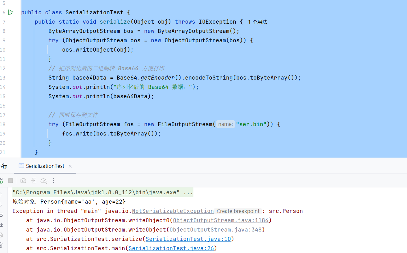 public static void main(String[] args) throws Exception { Person person = new Person("aa", 22); System.out.println("原始对象:" + person); serialize(person); } }