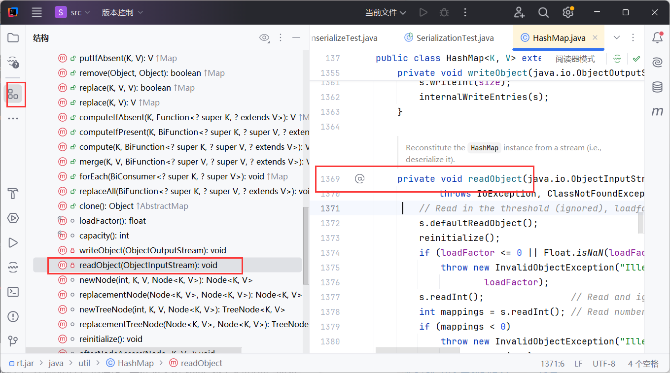 使用”结构”功能可以快速查看类中方法,找到重写的readObject类