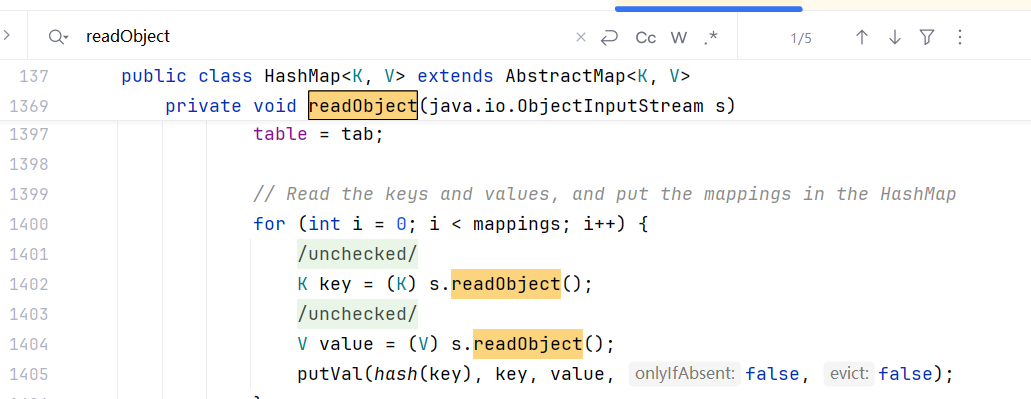 我们看到第 1416 行与 1418 行中,Key 与 Value 的值执行了 readObject 的操作