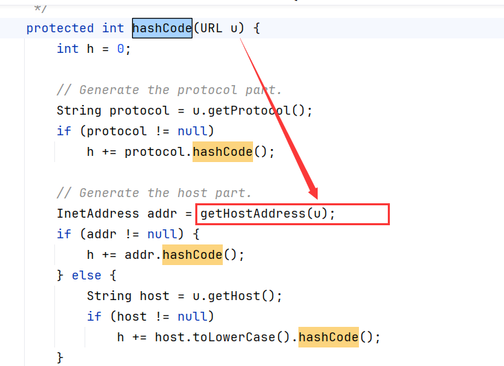 L 中的 hashCode 被 handler 这一对象所调用,handler 又是 URLStreamHandler 的抽象类。我们再去找 URLStreamHandler 的 hashCode 方法。