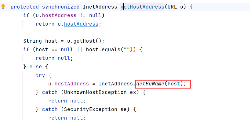 此方法中又调用了getByName(host)方法,它的作⽤是根据主机名,获取其 IP 地址,在⽹络上其实就是⼀次 DNS 查询。到这⾥就不必要再跟了。