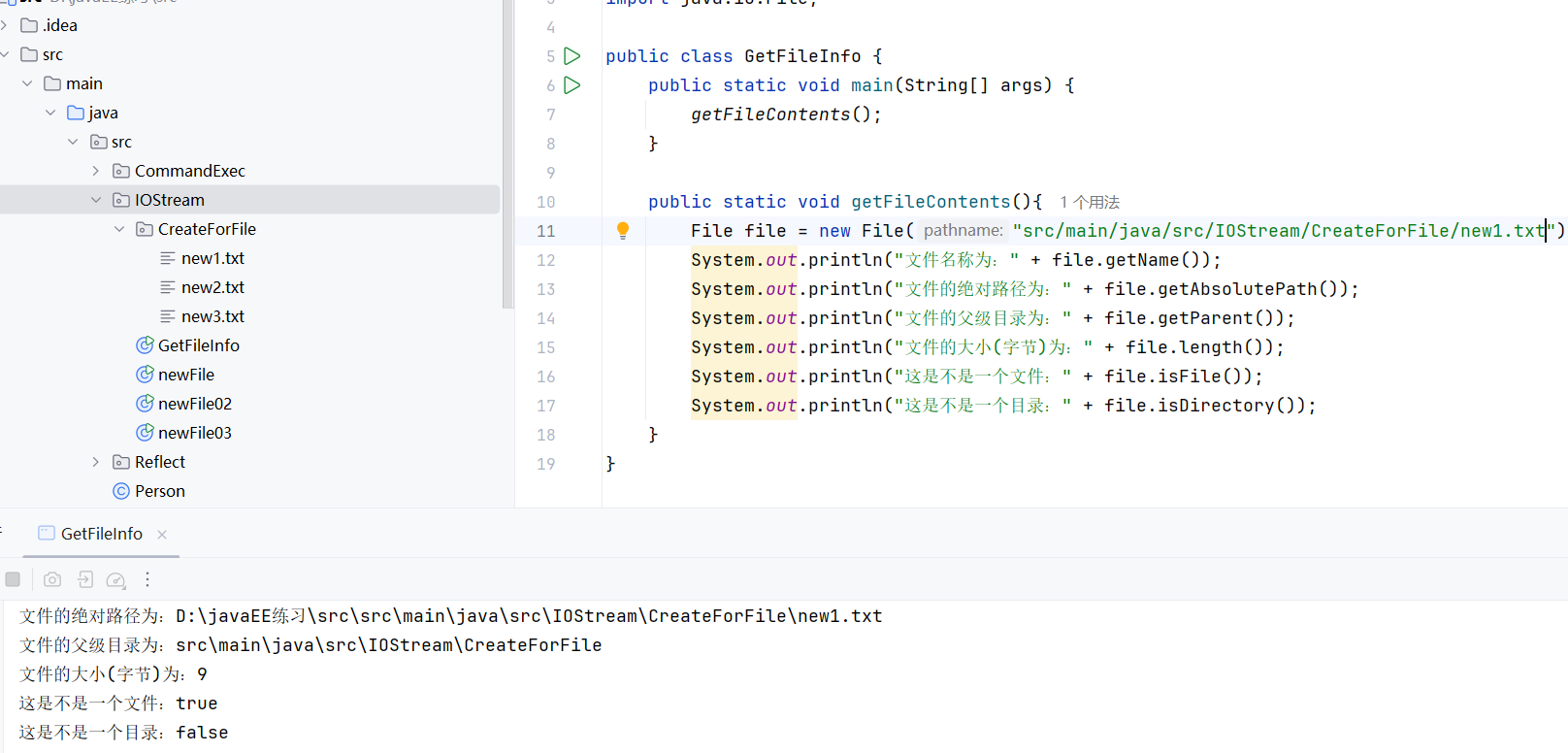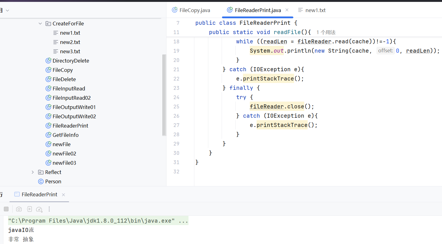 下方测试代码将会将 Serialable/src/IOStream/CreateForFile/new1.txt 中的 new1.tx 文件打印输出至控制台: