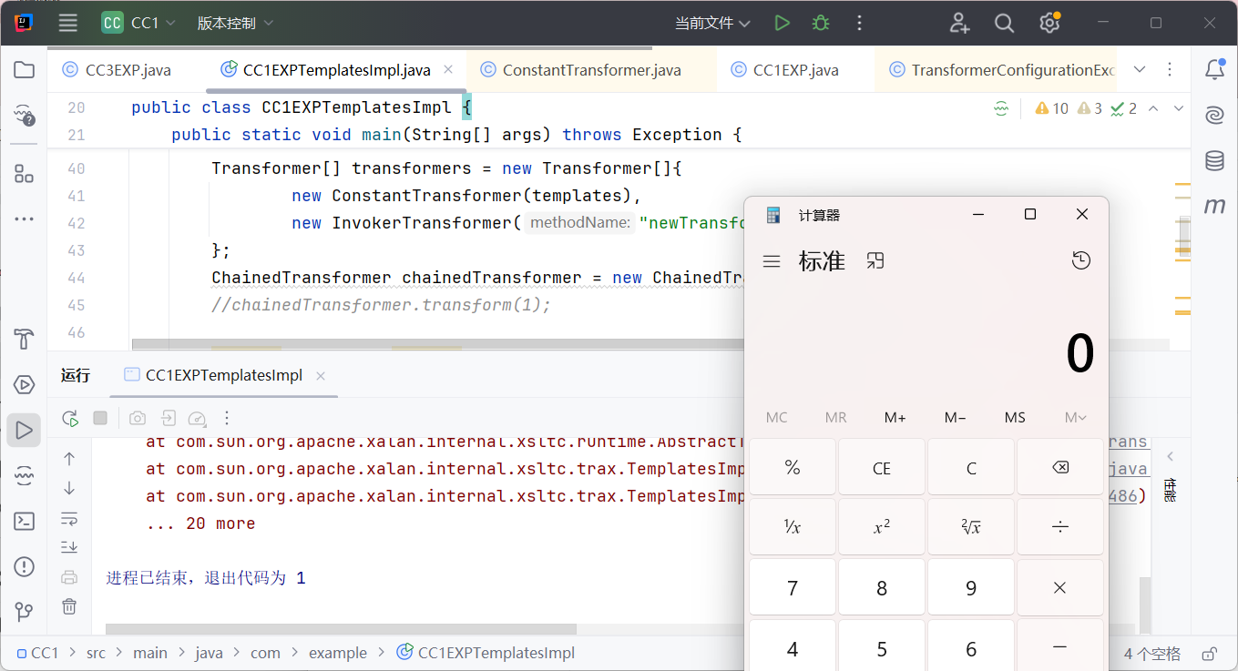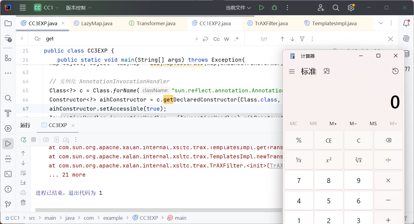 最后一句,传入 chainedTransformer.transform(1) 是因为前面我们定义了 new ConstantTransformer(templates),这个类是需要我们传参的,传入 1 即可。