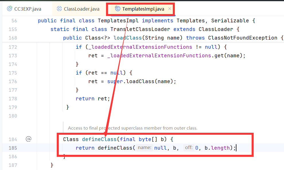 在 TemplatesImpl 类的 static class TransletClassLoader 中找到了我们能够运用的类。