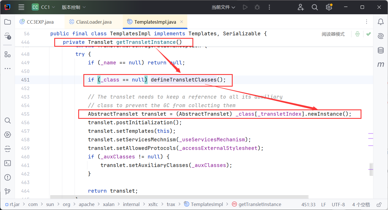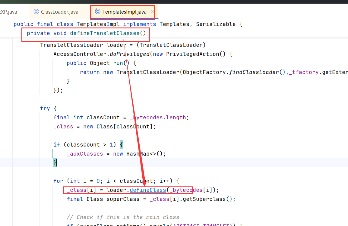 调用了 defineTransletClasses() 方法,并且这里有一个 newInstance() 实例化的过程,如果能走完这个函数那么就能动态执行代码