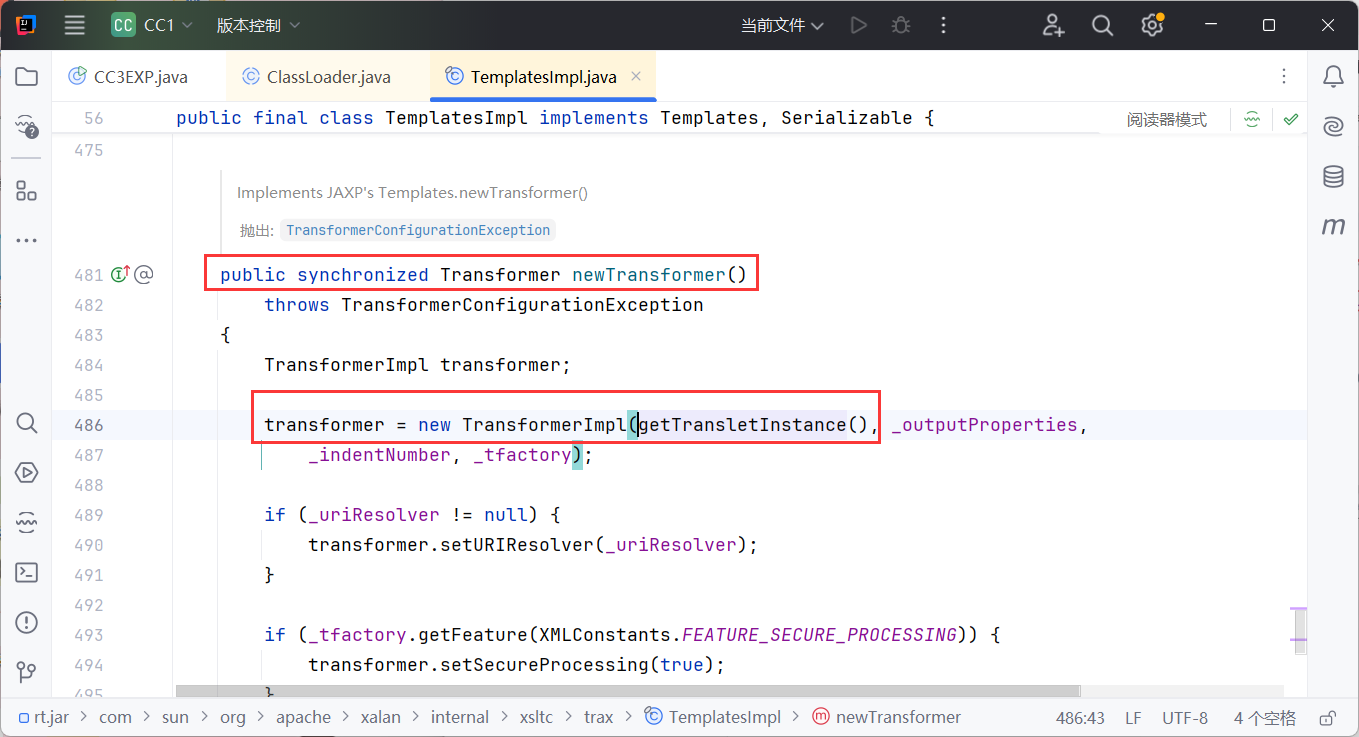 CC3 这里的作者没有调用 InvokerTransformer,而是调用了一个新的类 InstantiateTransformer。