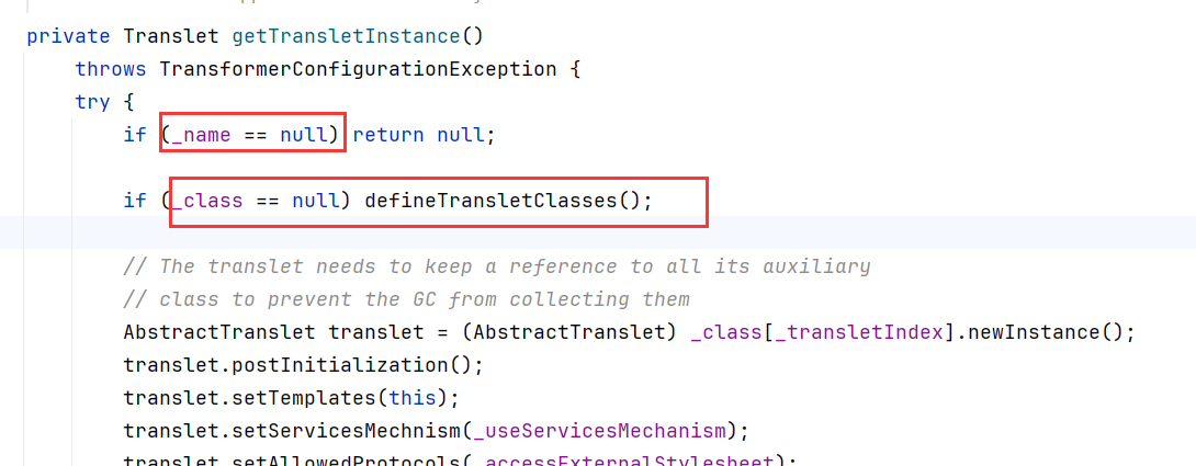 跟进到getTransletInstance方法查看代码执行条件