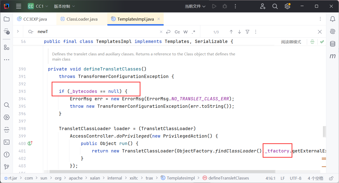 在 readObject() 方法中,找到了 _tfactory 的初始化定义。