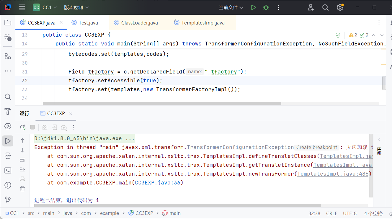public class CC3EXP { public static void main(String[] args) throws TransformerConfigurationException, NoSuchFieldException, IllegalAccessException, IOException { TemplatesImpl templates = new TemplatesImpl();