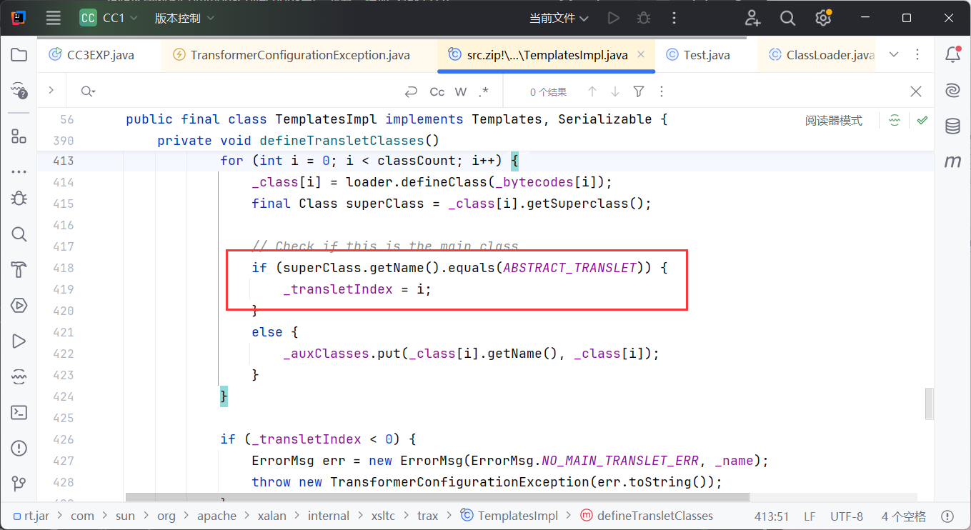 根据报错提示,我们来到defineTransletClasses方法,下一个断点