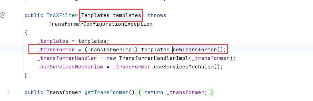 InstantiateTransformer instantiateTransformer = new InstantiateTransformer(new Class[]{Templates.class}, new Object[]{templates}); instantiateTransformer.transform(TrAXFilter.class); } }