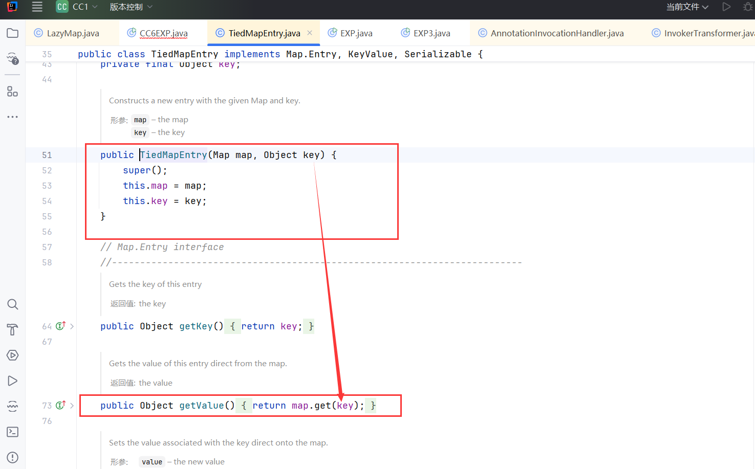 新建一个TiedMapEntry的实例并调用getValue方法,前面链子的内容是与CC1相同的,无需改动