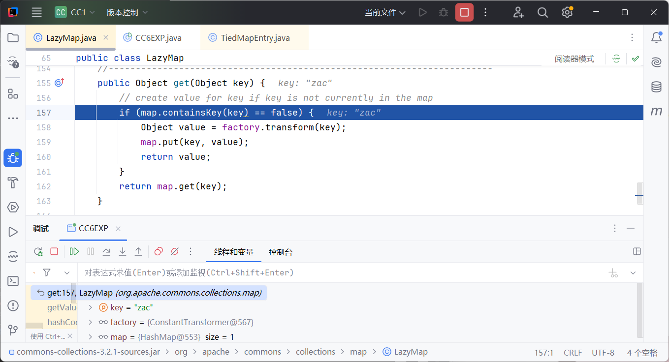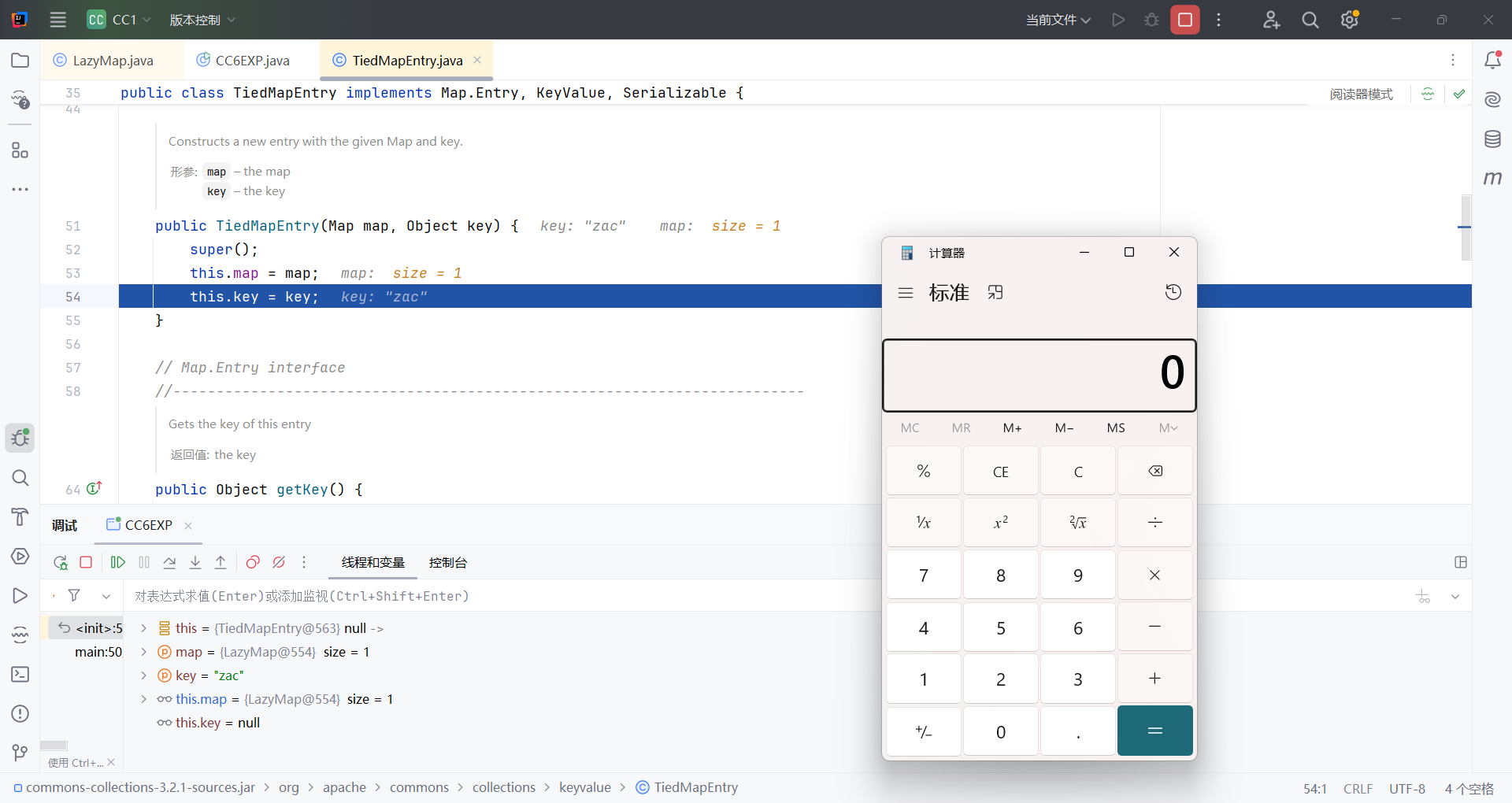 我们在TiedMapEntry tiedMapEntry = new TiedMapEntry(lazyMap, "zac");打断点可以看到,在走入构造方法时,就会弹出计算器了