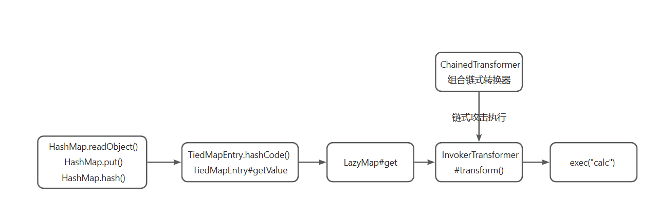 | xxx.readObject() HashMap.put() HashMap.hash() TiedMapEntry.hashCode() TiedMapEntry.getValue() LazyMap.get() ChainedTransformer.transform() InvokerTransformer.transform() Runtime.exec()