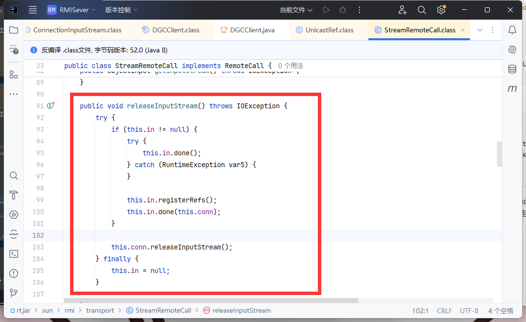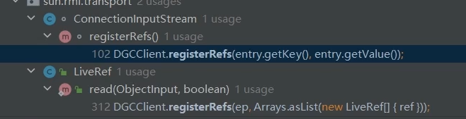 继续向前查找最终的流程是releaseInputStream去调用ConnectionInputStream.registerRefs然后进入到if中(这个判断条件中的incomingRefTable是为空的,我们后续会说怎么走到if里面)调用DGCClient.registerRefs