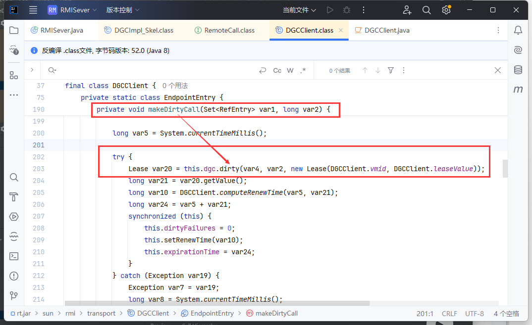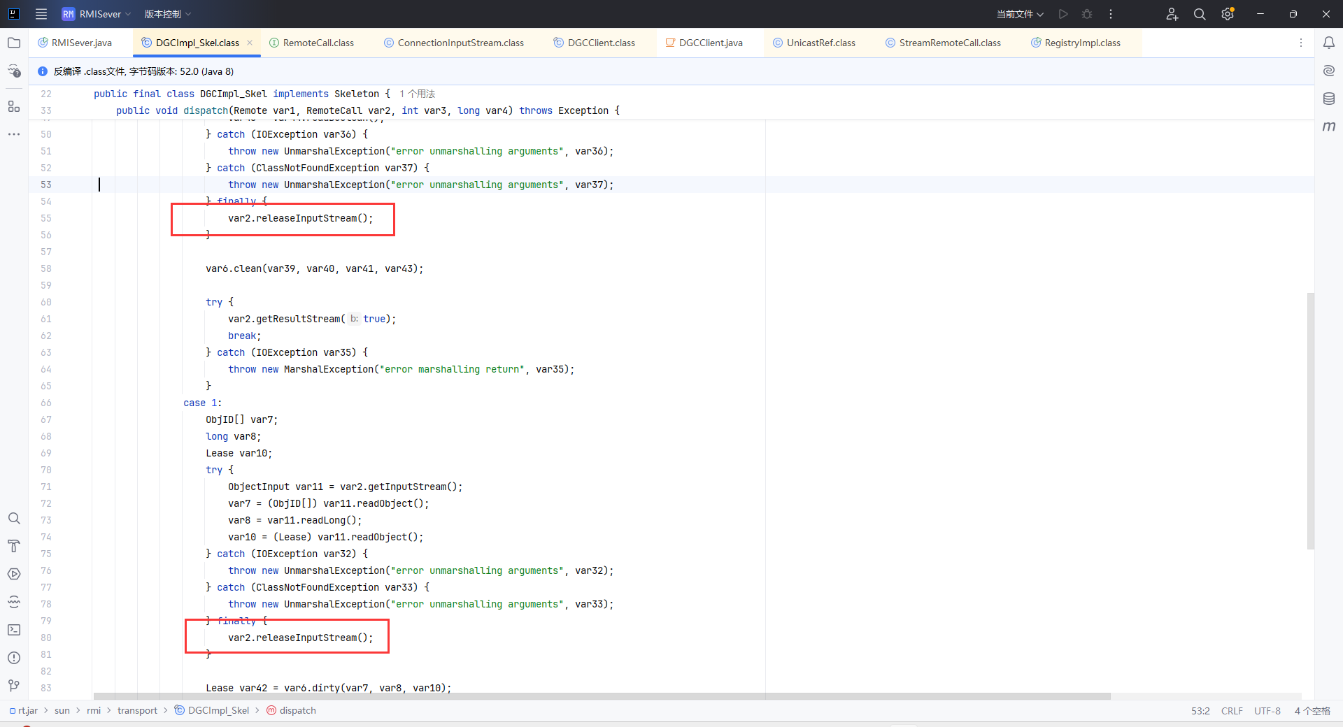 顺着向前查找,发现DGCImpl_Skel中dispatch是会调用这个方法的