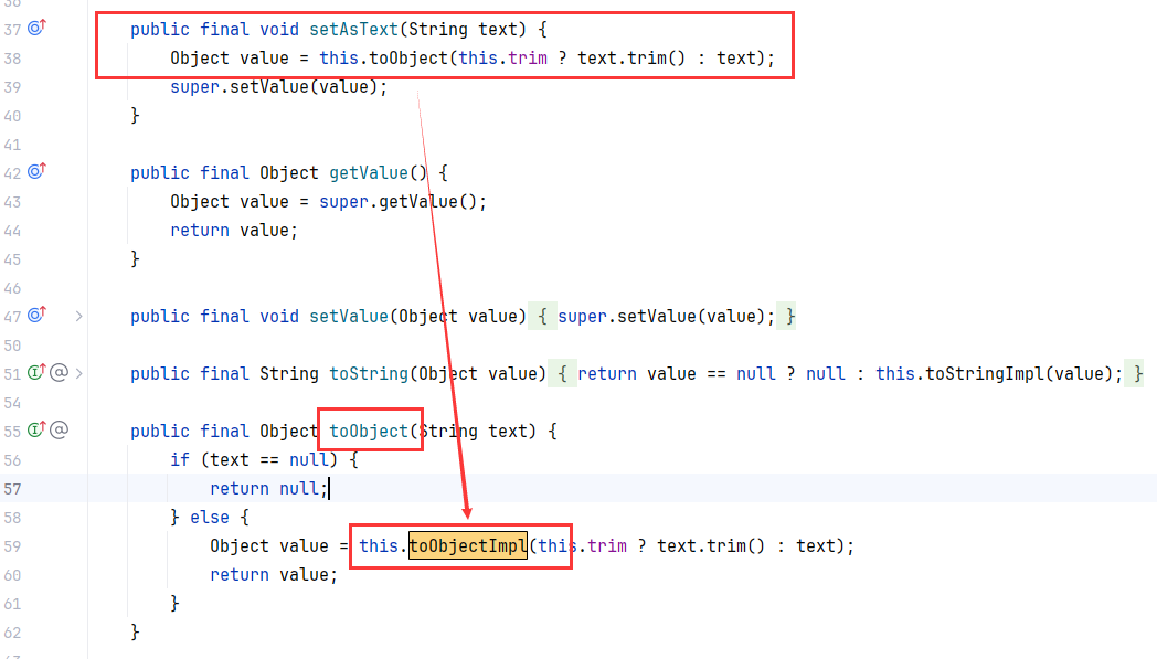 在父类 AbstractConverter 中,找谁调用了 JndiConverter#toObjectImpl(),找到了 AbstractConverter#setAsText();