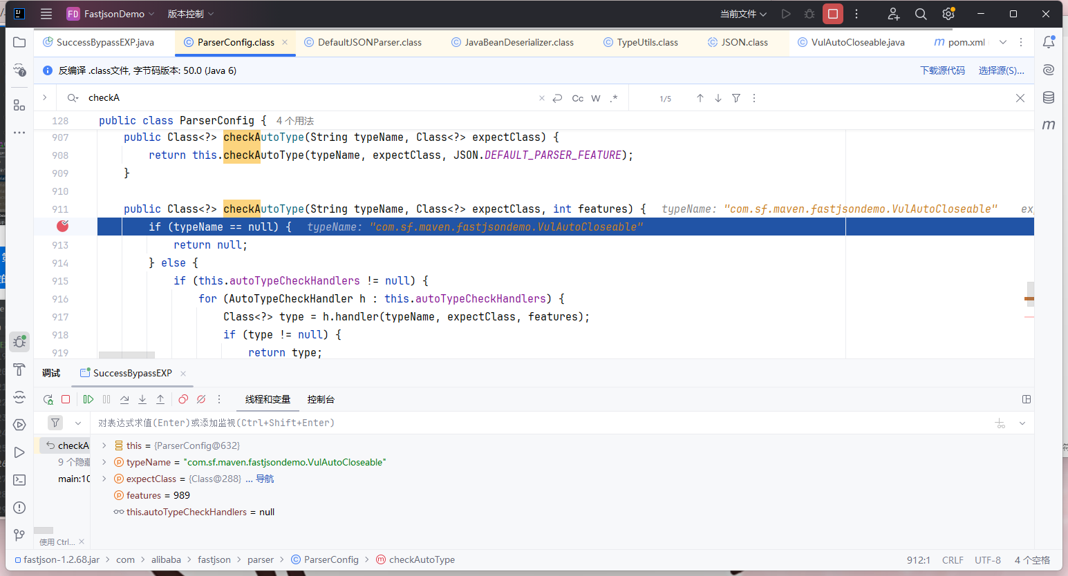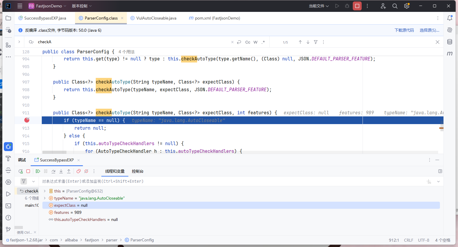 直接在 CheckAutoType() 函数上打上断点开始分析,函数位置:com\alibaba\fastjson\parser\ParserConfig.java