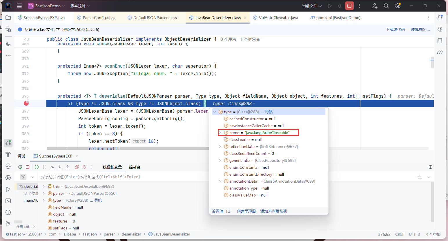 往里走,调用的是 JavaBeanDeserializer 的 deserialze() 方法进行反序列化操作,其中 type 参数就是传入的 AutoCloseable类,如图: