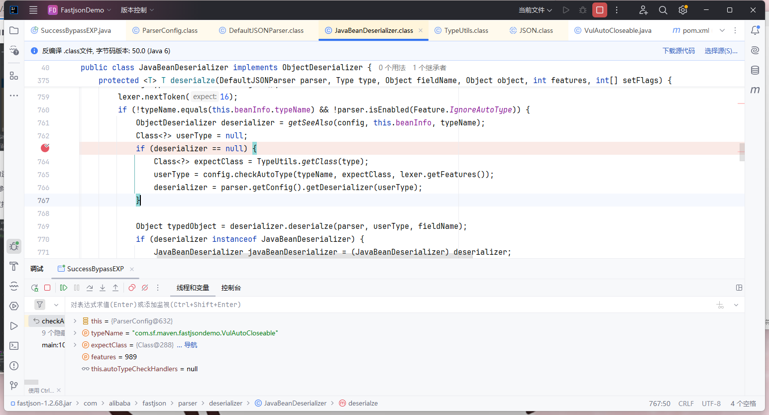 接着,返回到 DefaultJSONParser 类中获取到 clazz 后再继续执行,根据 AutoCloseable 类获取到反序列化器为 JavaBeanDeserializer,然后应用该反序列化器进行反序列化操作: