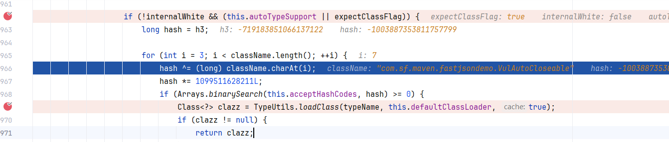 在checkAutoType下一个断点,看到跟之前一样会先进行哈希白名单匹配、然后进行哈希黑名单过滤,