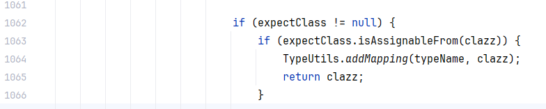 1 2 3 4 5 6 if (expectClass != null ) { if (expectClass.isAssignableFrom(clazz)) { TypeUtils.addMapping(typeName, clazz); return clazz; } }