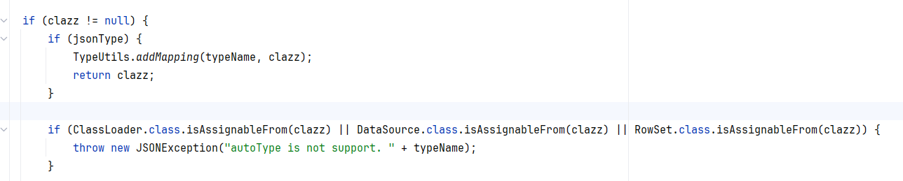 往下,判断是否jsonType、true的话直接添加Mapping缓存并返回类,否则接着判断返回的类是否是ClassLoader、DataSource、RowSet等类的子类,是的话直接抛出异常,这也是过滤大多数JNDI注入Gadget的机制: