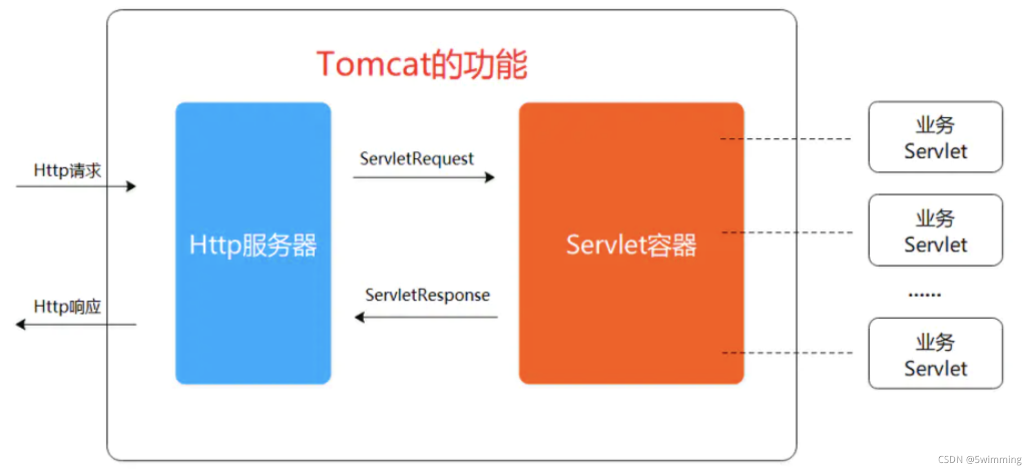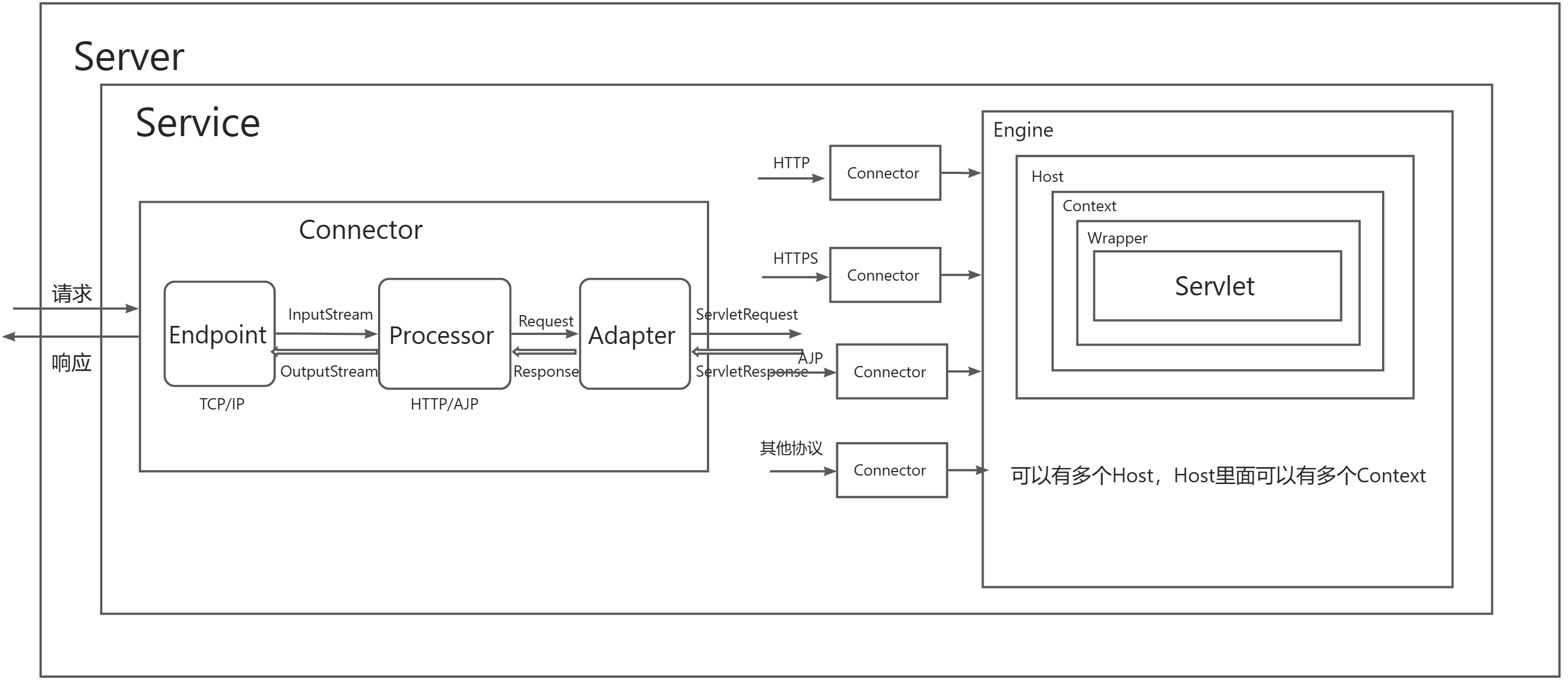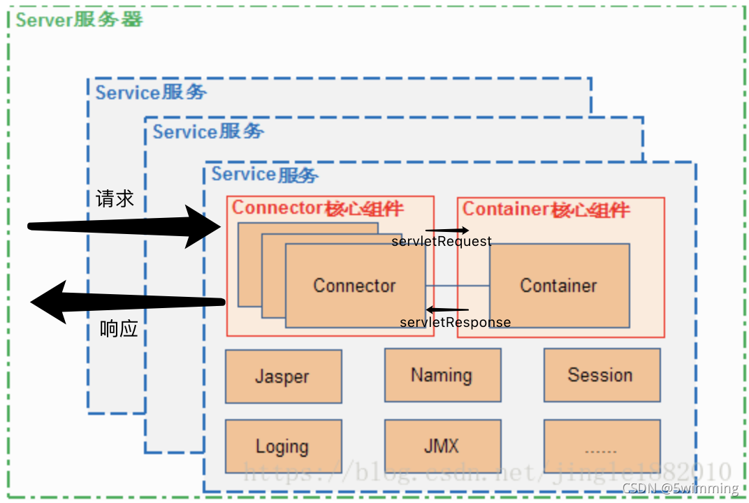 Connector 主要负责对外交流,进行 Socket 通信(基于 TCP/IP),解析 HTTP 报文,对应下图中的http服务器;