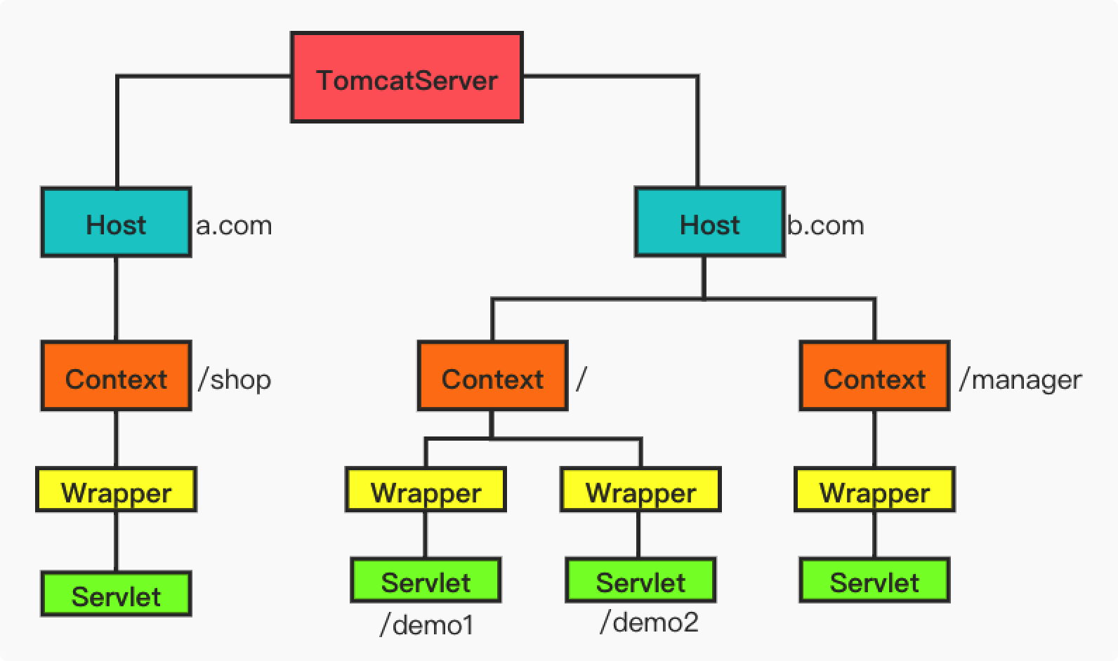 我们根据上面的基础知识可以知道 Tomcat 是 Web 应用服务器,是一个 Servlet/JSP 容器,而 Servlet 容器从上到下分别是 Engine、Host、Context、Wrapper。